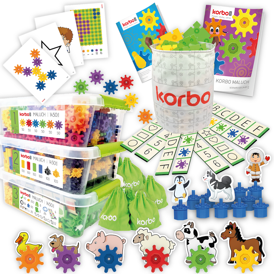 Klocki Korbo Zestaw Maluch Zawartość zestawu 1 książka ze scenariuszami zajęć dla przedszkolaków 1 książka SPE...