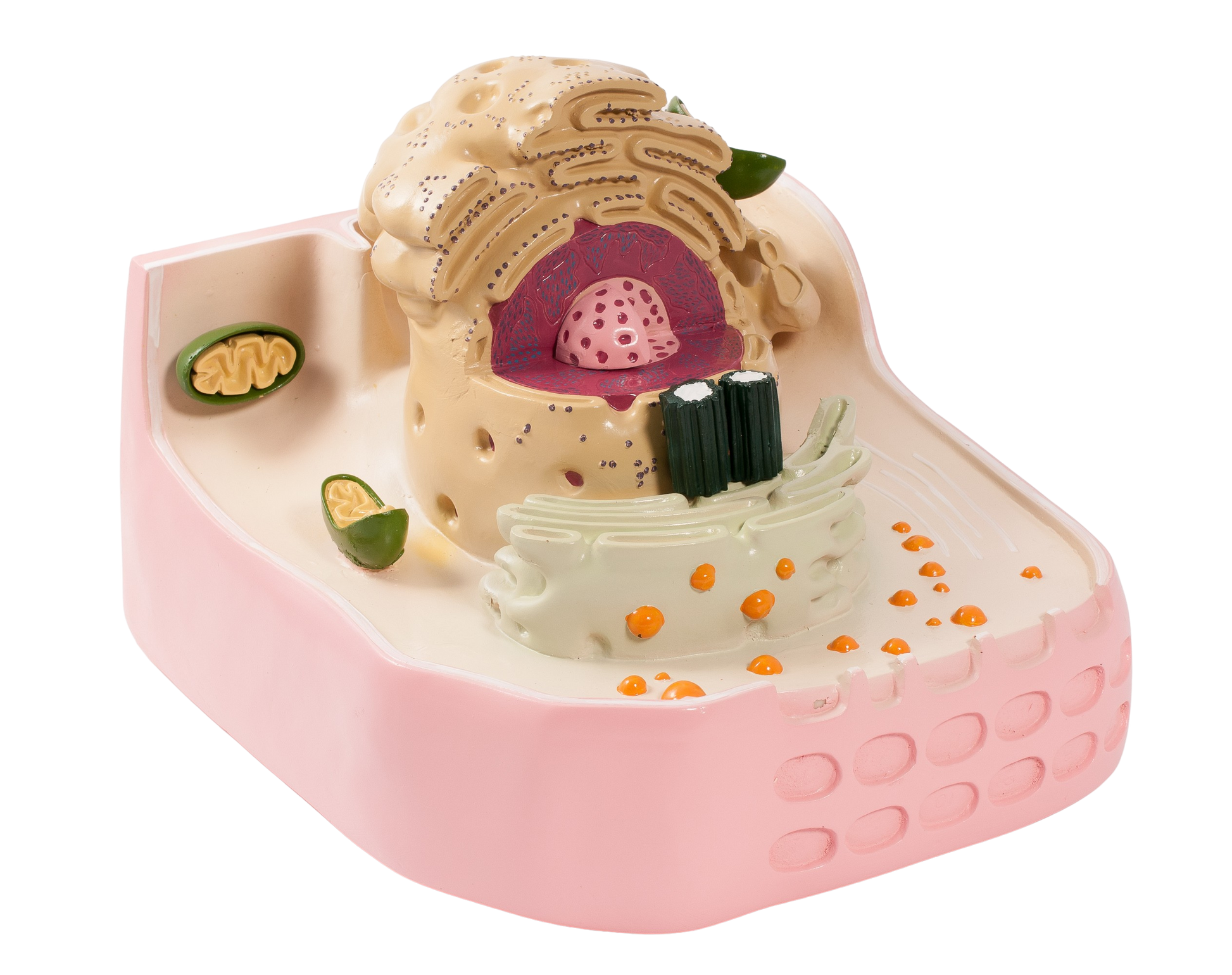 - Szczegółowa budowa: Model szczegółowo prezentuje budowę komórki roślinnej, eksponując ścianę komórkową, jądro komórkowe (z widocznymi niciami DNA) z jąderkiem, siateczki śródplazmatyczne, aparat Golgiego, mitochondria, chloroplasty, centriole i wodniczki.