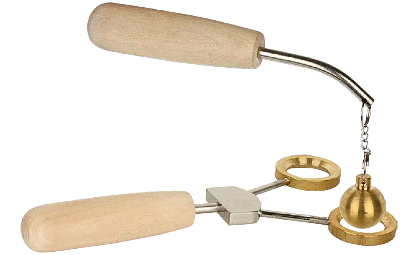Model dydaktyczny do demonstracji rozszerzalności cieplnej metali. Przyrząd składa się z dwóch drewnianych uchwytów, metalowej kulki zawieszonej na łańcuszku oraz dwóch pierścieni.